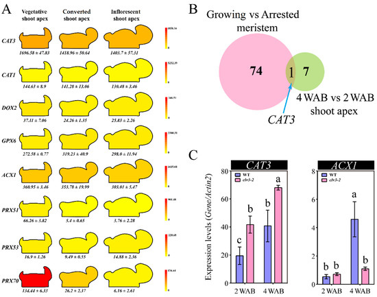 The expression profiles of ROS metabolism-related genes. (A) The expression patterns of eight ROS metabolism-related genes in the BAR database. The gene expression data in vegetative, converted (i.e., the transition from the vegetative stage to the proliferative stage), and inflorescent (i.e., proliferative stage) shoot apex are shown. (B) Common gene isolation between two published RNA-seq datasets. One is the comparative data using growing and arrested meristems, and the other is the comparative data using 2 WAB and 4 WAB shoot apexes. (C) The expression profiles of the ROS clearance-related gene CAT3 and ROS production-related ACX1 at 2 WAB and 4 WAB in WT and clv3-2 IM tissues. qRT–PCR assays were performed. Each experiment was replicated three times, and error bars indicate SD. One-way ANOVA post Tukey’s HSD test (p < 0.05) was carried out to calculate the differences among different groups. Different letters indicate significant differences, while the same letters indicate no significant differences.