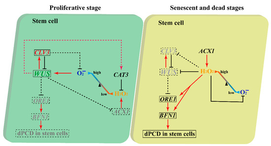 In this study, we first monitored the dynamic spatiotemporal patterns of ROS species and H2O2 in proliferative and senescent SAMs. By applying exogenous H2O2, we found that the accumulation of H2O2 could not only inhibit WUS expression but also induce dPCD in stem cells. Moreover, we used two scavengers, N,N′-dimethylthiourea (DMTU) [10,17] and potassium iodide (KI) [10,13], to reduce the levels of and H2O2, respectively, in the inflorescence meristem (IM) domain. The results further explored the function of H2O2 in shutting down stem cell activity, leading to the activation of the dPCD process in the stem cell population. Based on this evidence, we established a regulatory model in which ROS dynamics were thought to be at the core of explaining the ROS-mediated mechanism of stem cell dPCD. The results of this study can enrich our understanding of age-dependent dPCD in stem cells and may help to facilitate the regulatory mechanism of stem cell fate governing the whole plant lifespan.