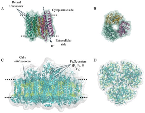 - Jordan, P.; Fromme, P.; Witt, H.T.; Klukas, O.; Saenger, W.; Krauss, N. Three-dimensional structure of cyanobacterial photosystem I at 2.5 A resolution. Nature 2001, 411, 909–917. [Google Scholar] [CrossRef]