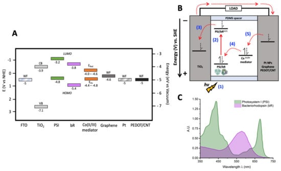Teodor, A.H.; Monge, S.; Aguilar, D.; Tames, A.; Nunez, R.; Gonzalez, E.; Rodríguez, J.J.M.; Bergkamp, J.J.; Starbird, R.; Renugopalakrishnan, V.; et al. PEDOT-Carbon Nanotube Counter Electrodes and Bipyridine Cobalt (II/III) Mediators as Universally Compatible Components in Bio-Sensitized Solar Cells Using Photosystem I and Bacteriorhodopsin. Int. J. Mol. Sci. 2022, 23, 3865. https://doi.org/10.3390/ijms23073865