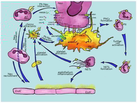An analysis of the platelet–neutrophil interactions cannot be complete without mentioning the contribution of endothelial cells. Indeed, blood vessel endothelial cells orchestrate the activation of neutrophils, platelets and the coagulation cascade. Upon activation, endothelial cells secrete the content of their Weibel–Palade bodies including vWF []. vWF interacts with platelet GPIbɑ, which also enables the interaction of platelets with neutrophil β2 integrins [,], and it has been proposed that vWF potentiates this interaction. vWF can attract neutrophils to endothelium independently of platelets, and this process depends on the activity of ADAMTS-13—a metalloproteinase required for the conversion of ultra-large vWF multimers into functional vWF []. Other contributions of endothelial cells to platelet–neutrophil heteroaggregate formation are based on their ability to bind pro-inflammatory chemokines to their surface []. It has been demonstrated that CCL5 and CXCL4 become immobilized on the endothelium and thereby attract neutrophils and monocytes downstream of the site of ongoing thromboinflammation []. Finally, upon neutrophil extravasation from the blood flow, a complex interplay between endothelial cells and platelets maintains blood vessel wall integrity, and this process is mediated by platelet CLEC-2 and GPVI receptors as well as granule release [,].