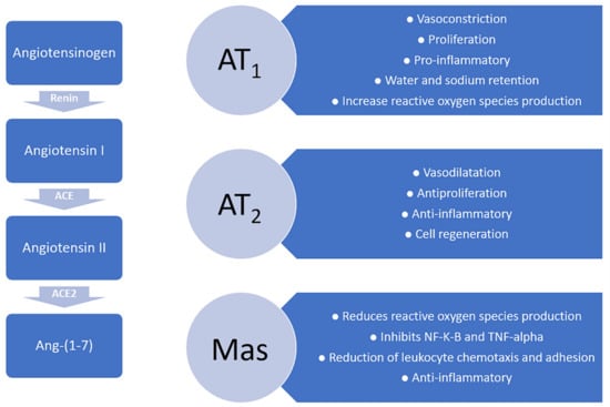 The activation of Mas decreases oxidative stress and inhibits the nuclear Kappa-Light-Chain-Enhancer factor of activated B-cell lymphocytes (NF-K-B) and TNF-Alpha []. The inhibition of NF-K-B by Ang-(1-7) was proven to prevent the upregulation of vascular adhesion protein-1 by angiotensin II as well as the reduction in leukocyte chemotaxis and adhesion [].