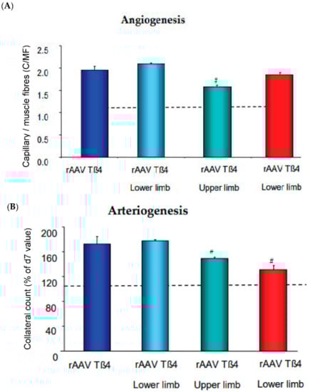 Angiogenesis and arteriogenesis upon recombinant AAV (rAAV) encoding for Thymosin ß4 (Tß4). (A) Capillary/muscle fiber ratio (C/MF) after application of rAAVTß4 either whole limb (retrograde venous infusion) or lower limb (intramuscular injection) with or without L-NAME coapplication. (B) Collateral count (% of d7 level) at d28. Dotted lines are control group levels. For methods cf. [].