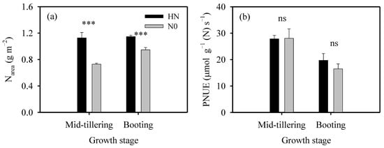 Area-based leaf N content (Narea, (a)) and photosynthetic nitrogen use efficiency (PNUE, (b)) of plants under high N (HN) and zero N (N0) treatments at mid-tillering and booting stages. One-way analysis of variance (ANOVA) was used to assess the effect of N supply on parameters. ***, p < 0.001; ns, non-significant at p < 0.05 level.