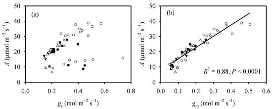 Photosynthesis is sensitive to temperature, increasing with increasing temperature, but decreasing dramatically at supra-optimal temperature []. The increase in A with temperature is suggested to at least partially correlate with the increase in gm []. In line with previous studies, in the present study, the response of A to temperature was similar to that of gm, while the response of gs to temperature was different from both A and gm (Table 1). This suggested that the response of photosynthesis to temperature is mainly driven by the gm-T relationship.