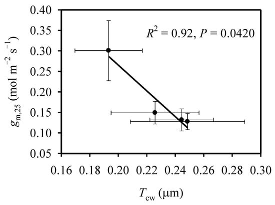 The relationship between mesophyll conductance at 25 °C (gm,25) and cell-wall thickness (Tcw).
