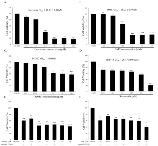 2.2. Inhibitory Effect of Curcuminoids (Curcumin, DMC, and bDMC) Alone and in Combination Treatment with Semaxanib (SU5416) on Cytotoxicity of HUVECs