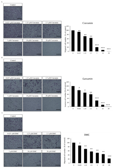 - Lin, S.S.; Lai, K.C.; Hsu, S.C.; Yang, J.S.; Kuo, C.L.; Lin, J.P.; Ma, Y.S.; Wu, C.C.; Chung, J.G. Curcumin inhibits the migration and invasion of human A549 lung cancer cells through the inhibition of matrix metalloproteinase-2 and -9 and Vascular Endothelial Growth Factor (VEGF). Cancer Lett. 2009, 285, 127–133. [Google Scholar] [CrossRef]