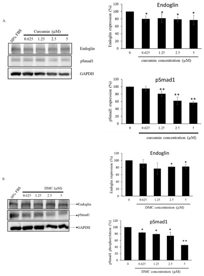2.5. Curcuminoids Decreased Endoglin and Smad1 Phosphorylation in HUVECs