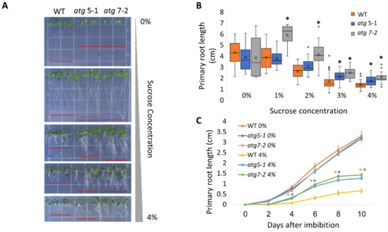 atg mutants display reduced sensitivity to sucrose excess. (A,B). WT, atg5-1, and atg7-2 plants were sown on Nitsch plates containing increasing concentrations of sucrose, and grown vertically for 14 days. (A) Representative image of the plants. (B) Quantification of primary root length under various sucrose treatments. Asterisk denotes a significant difference from WT under the same treatment conditions, as determined by Dunnett’s test (p < 0.05, n = 10–30), x indicates sample mean, and circles denote outliers. (C) WT, atg5-1, and atg7-2 plants were sown on Nitsch plates containing 0% or 4% sucrose and grown vertically. The primary root length was measured every two days for 10 days after imbibition. Data are presented as the average ± SE. An asterisk denotes a significant difference from WT under the same treatment conditions and at the same time point, as determined by Dunnett’s test (p < 0.05, n = 12–31). Dark grey—atg5-1, light grey—atg7-2.