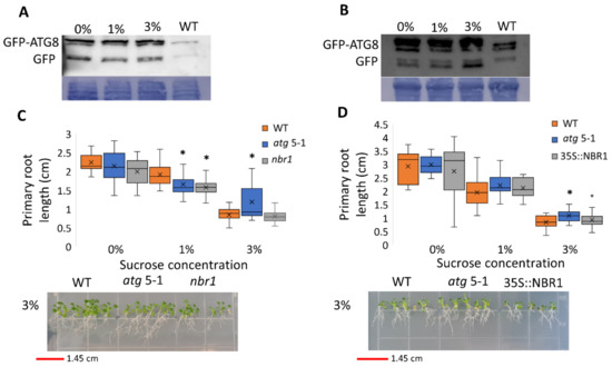 Sucrose excess induces autophagy in the shoots but not in the roots, and the root phenotype is not NBR1-dependent. (A,B) GFP-ATG8f plants were sown on Nitsch plates containing increasing concentrations of sucrose, and grown for 10 days. (A) Roots and (B) shoots were collected separately, and proteins were extracted and analyzed by Western blot using an anti-GFP antibody. Equal protein loading was verified by Coomassie brilliant blue staining. (C) WT, atg5-1, nbr1, or (D) NBR-OX (35S::NBR1) plants were sown on Nitsch plates containing increasing concentrations of sucrose and grown vertically for 14 days, after which the primary root length was quantified (top panel). An asterisk denotes a significant difference from WT under the same treatment, as determined by Dunnett’s test (p < 0.05, n = 10–30), x indicates sample mean, and circles denote outliers. Bottom panel—a representative image of the plants.