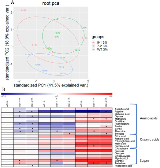 Due to the substantial effect previously shown of autophagy on plant metabolism [5,6,8,9,10], the metabolic profile of WT and atg mutant roots and shoots from plants grown under sucrose excess was evaluated. After growing seedlings for 10 days, as described above, polar metabolites were extracted and analyzed by gas-chromatography mass-spectrometry (GC-MS). Shoot analysis revealed distinct metabolite profiles for each treatment, but no differences between the lines (Figure S5A, Table S1). Principal component analysis (PCA) of root metabolites demonstrated that, as in the shoots, sucrose excess had a significant effect on metabolic profiles (Figure S5B). In addition, when performing PCA of each individual treatment, minor differences between the lines were noted (Figure 5A and Figure S5C,D).