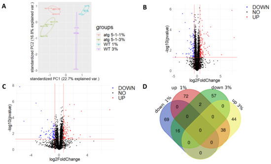 Proteomic analysis of roots revealed differences in protein levels during sucrose excess and between WT and atg5-1 plants. WT and atg5-1 were sown on Nitsch plates containing 1% or 3% sucrose and grown vertically for 10 days. Roots were then collected and subjected to proteomic analysis by liquid chromatography with tandem mass spectrometry (LC-MS/MS). (A) PCA of the label-free quantification (LFQ) values of the entire proteome. (B) Volcano plot for 1% sucrose—p values and fold-change relative to atg5-1. (C) Volcano plot for 3% sucrose—p values and fold-change relative to atg5-1. (D) Venn diagram of differentially accumulated proteins: http://bioinformatics.psb.ugent.be/webtools/Venn/, accessed on 26 December 2021.