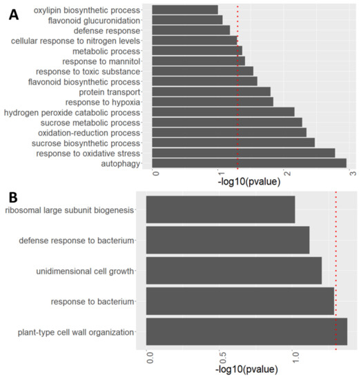 atg5-1 shows alterations in many biological processes under high sucrose levels. Enriched biological processes identified from proteomics analyses performed using David functional annotation tools in GOTERM_BP_DIRECT. (A) Biological processes involving protein accumulation in atg5-1 compared to WT under 3% sucrose. (B) Biological processes involving protein depletion in atg5-1 compared to WT under 3% sucrose. The red dotted line indicates the threshold for significant enrichment of the given proteins for the biological process (p < 0.05).
