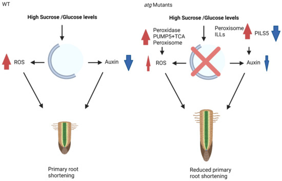 Proposed mechanism of action for autophagy during sucrose excess. In WT plants under high sucrose/glucose levels, primary root shortening occurs via the accumulation of ROS and reduced levels of auxin. In contrast, under similar conditions, atg mutant plants present reduced ROS accumulation, which is mediated via peroxidases, PUMP5, TCA cycle enzymes, and peroxisomal activity. There is also less auxin reduction, which is mediated by peroxisomal proteins and ILL activity. These changes in protein and organellar activity lead to reduced primary root shortening. Red arrows indicate upregulation, blew arrows indicate downregulation.