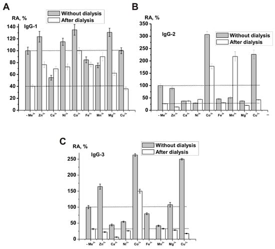 Effect of the dialysis of three individual IgG preparations from sera of schizophrenic patients against EDTA and different external metal ions on the relative activity (RA, %) of dialyzed and non-dialyzed preparations (A–C). The relative activity of every non-dialyzed preparation was taken for 100%. All IgGs and metal ions used are marked on Panels A–D [161].