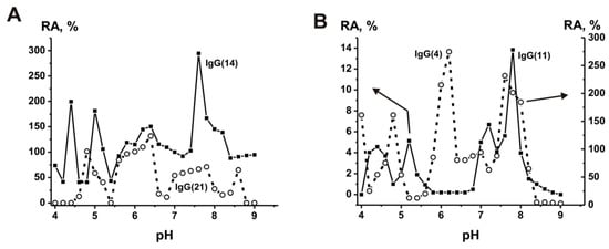 Dependences of the relative catalase activity of four schizophrenic patients’ IgGs on pH of the reaction mixture (A,B). All relative activities of IgG(14) at pH 7.0 were taken for 100 percent. The errors in the initial rate determination from three experiments in each case did not exceed 7–10% [161].