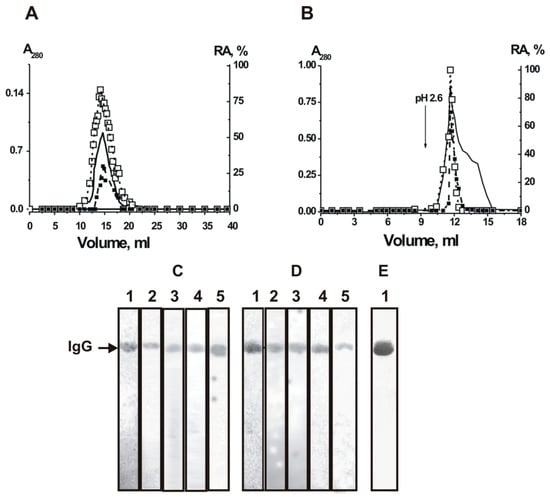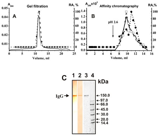 Gel filtration of rat IgGs on a Superdex 200 column in an acidic buffer (pH 2.6) after Ab incubation with this buffer (A) and affinity chromatography of IgGs on Sepharose bearing immobilized rabbit IgGs against rat IgGs (B): (—), absorbance at 280 nm; the relative activity of IgGs (RA, %) was measured using DAB in the presence (•) and the absence (□) of H2O2. In situ SDS-PAGE analysis of rat IgGs peroxidase and oxidoreductase activities (C). The peroxidase activity was revealed by incubation of longitudinal gel slices in the reaction mixture containing DAB, 10 mM H2O2, and 5 mM CuCl2 (lane 1, C), while peroxide-independent oxidoreductase activity—incubation without H2O2 (lane 2, C). An additional control longitudinal band of the same gel was stained with Coomassie R250 to reveal IgG positions (lane 3, C). Arrows show the positions of proteins’ molecular mass markers (lane 4, C) [171].