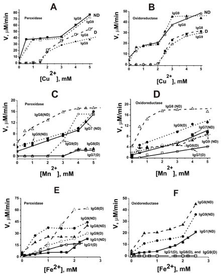 Dependencies of the peroxidase and oxidoreductase activities in the IgG-dependent oxidation of DAB (0.2 mg/mL) on the concentration of CuCl2 (A,B), MnCl2 (C,D), and FeCl2 (E,F). Curves corresponding to dialyzed (D) and non-dialyzed (ND) IgGs (5 µg/mL) and numbers of IgG preparations are marked in Panels A–F [172].