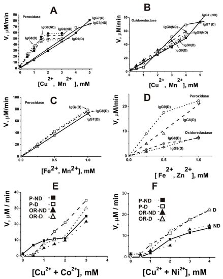 Dependencies of the peroxidase and oxidoreductase activities in the IgG-dependent oxidation of DAB (0.2 mg/mL) on the concentration of equimolar mixtures of MnCl2 with CuCl2 (A,B), FeCl2 with MnCl2 or ZnCl2 (C,D); CuCl2 with CoCl2 (E); NiCl2 (E); or NiCl2 (F). Curves corresponding to dialyzed (D) and non-dialyzed (ND) IgGs (5 µg/mL) and the numbers of IgG preparations are marked in Panels (A–F). Additional designations in (E,F) panels refer to non-dialyzed and dialyzed (P-ND and P-D) peroxidase and non-dialyzed and dialyzed (OR-ND and OR-D) oxidoreductase activities of IgGs [172].