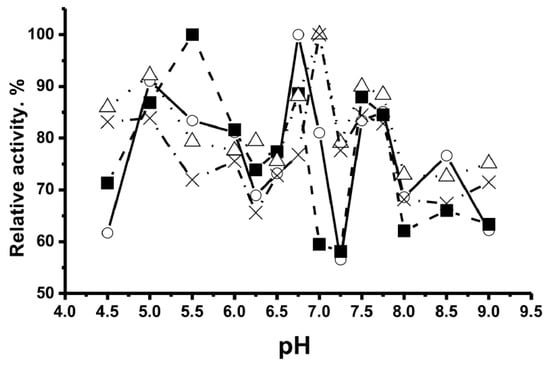 Dependences of the relative peroxidase activity of four Wistar rats IgGs (∆, □, ×, and o) on pH of reaction mixture The error in the initial rate determinations from three experiments in each case did not exceed 7–10% [174].