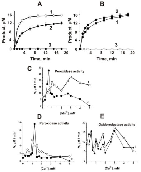 As indicated above, the iron ion is involved in the catalysis of reactions catalyzed by different peroxidases. It has been shown that IgG abzymes of Wistar rats with peroxidase and oxidoreductase activities catalyze the oxidation of DAB only in the presence of different metal ions [172]. Using the atomic emission method with excitation of spectra in a two-jet arc plasmatron, several divalent metal ions (Fe ≥ Pb ≥ Zn ≥ Cu ≥ Al ≥ Ca ≥ Ni ≥ Mn > Co ≥ Mg) were found bound with homogeneous IgG preparations obtained by standard methods [169,170,171]. All IgG preparations completely lost their activity after removing metal ions associated with them using EDTA [172]. Several external metal ions activated significantly both peroxidase and oxidoreductase activities of non-dialyzed against EDTA IgGs containing different internal metals showing pronounced biphasic dependencies corresponding to ~0.1–2.0 and ~2–5 mM of Me2+. For example, Figure 4 demonstrates several typical dependencies.