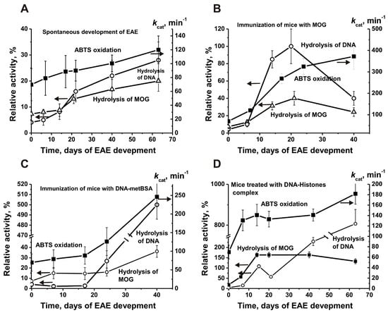 - Tolmacheva, A.S.; Aulova, K.S.; Urusov, A.E.; Orlovskaya, I.A.; Nevinsky, G.A. Increase in Autoantibodies-Abzymes with Peroxidase and Oxidoreductase Activities in Experimental Autoimmune Encephalomyelitis Mice during the Development of EAE Pathology. Molecules 2021, 26, 2077. [Google Scholar] [CrossRef]