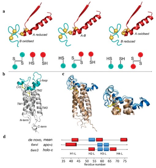 Recently, by comparing four thioredoxin proteins as promising redox partners of VKOR, we (i) suggested that human Protein Disulfide Isomerase (PDI) is the most probable hVKORC1 redox protein and (ii) proposed molecular complex PDI–hVKORC1 as a first precursor to probe thiol–disulfide exchange reactions between PDI and hVKORC1 []. For the complex modelling, the de novo model of hVKORC1 in the oxidised inactive state was used as a target of PDI. The de novo model is composed of the transmembrane four-helix bundle crowned by the intrinsically disordered (ID) luminal loop (L-loop, R33-N77) (Figure 1b), protruding in the endoplasmic reticulum lumen [].