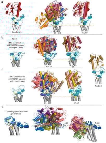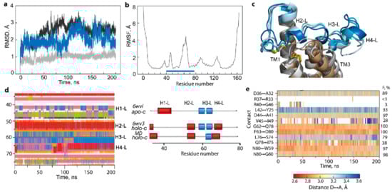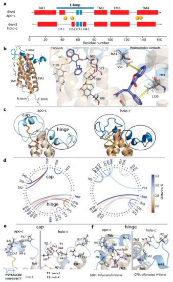 In addition to the evident change in L-loop folding, the relaxed forms demonstrate significant conformational mobility, viewed by the displacement of their helices with respect to the TMD, and the decrease of the distance between centroids defined on the cap and hinge of the L-loop was especially noticeable in the relaxed apo-h model (Figure 5e). Conformations of the relaxed forms showed that a temporary restriction of H-bond Q78···G62 promotes the displacement of two L-loop regions, hinge to cap, and that this effect is more pronounced in relaxed apo-h form. The proximal position of the cap and hinge was observed early in the predominant L-loop conformation of the de novo model [].