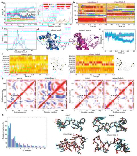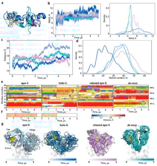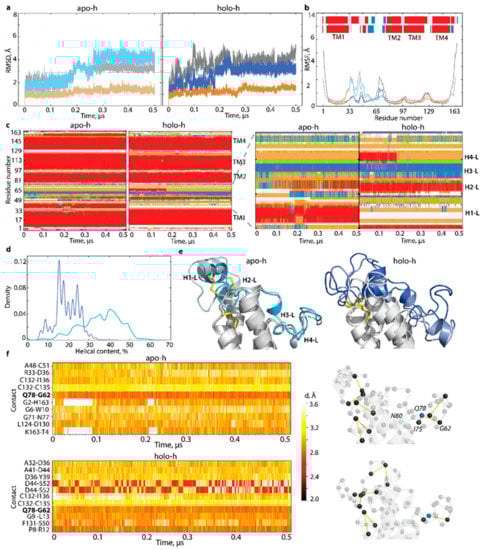 By comparing the relaxed models with the models stabilised by the H-bond Q78···G62, we observed that the H-bond alternation (its presence or absence) is connected to L-loop folding (Figure 5). Despite the cap secondary structures conservation in both models (H1-L helix in apo-h and a random coil with two turns in holo-h), (i) an H2-L helix formed in apo-h over GaMD simulation, was preserved in the relaxed apo-h model only during the first 100 ns (with H-bonds prevented), and, later (ii) (with the fully lifted restriction on the L-loop ends), was transformed into short-lived 310-helix, which was further partially denatured in a coil; (iii) two adjacent 310-helices (H3-L) were converted into a unique helix folded as an α-helix in the relaxed apo-h and a 310-helix in the relaxed holo-h; (iv) H4-L helix was also unstable in two forms, reversibly transiting from α-helix to a coil. As a result, the number of folded structures (α- and 310-helices) in the L-loop of each relaxed model was not identical to the forms stabilised by the H-bond Q78···G62 (Figure 4c,d and Figure 5b,c). Each relaxed form shows a clear evolution of its folding, which increased in apo-h and reduced in holo-h, demonstrating a tendency to be comparable in both forms.