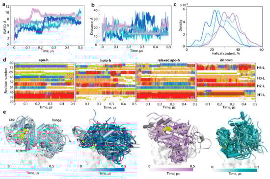 Comparing time-related folding, we observe that transient events in different segments of the L-loop sequence may be mutually related or not. Thus, the ordering of one helix favours an unfolding of the other, as seen in the de novo model or holo-h form of the L-loop simulated with restrained N- and C-ends (Figure 6e). On the other side, holo-h form conformations display H2-L unfolding (from ~1 µs) followed by a H3-L transition to a coil (from 2 µs), synchronous with H4-L unfolding. The significant decrease in holo-h L-loop folding is partially compensated by the H1-L increase in length and transient H3-L folding as the α-helix. Nevertheless, the helical content of this form is obviously lower than in other studied L-loop entities. The folding of distinct segments in apo-h and relaxed apo-h forms shows different folding–unfolding effects relationships—interrelated, disconnected, and their combination. Therefore, interrelations between folding–unfolding effects in a disordered L-loop are apparently more sophisticated than their description at the secondary structures level and probably also depend on global and local flexibility.