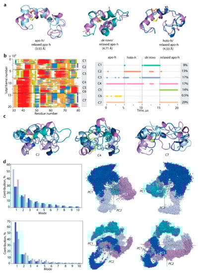 Thirdly, concatenated data combining cMD trajectories of the L-loop cleaved from apo-h, holo-h, relaxed apo-h forms, and the de novo model were analysed with principal component analysis (PCA). The projection of the generated conformations on the principal components PC1-PC3 shows partially overlapped subspaces (Figure 8d). These overlapped areas relay, successively, all subspaces and form compact generic ensembles of L-loop conformations. Evidently, the generic ensemble combined from subspaces does not represent a full conformational space of the disordered L-loop but reflects more exhaustively its conformational properties than a unique subspace.