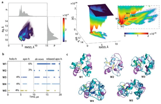 Free energy landscape of cleaved L-loop as a function of reaction coordinates, versus RMSD. (a) Two-dimensional- (left) and three-dimensional (middle) representations of the L-loop conformational ensembles’ relative Gibbs free energy, zoomed in on the principal wells (right). Probability density (P) of each reaction coordinate is shown on the 2D map top and right. (b,c) Content of each well (W1–W5) illustrated as the superimposed representative conformations. All conformations were generated by cMD simulations of different forms of L-loop and fitted on the average conformation calculated on the merged data. The red colour on 2D and 3D diagrams represents the highest occurrence, yellow and green low, and blue represents the lowest occurrence. The free energy surface was plotted using MATLAB. L-loop is shown as a cartoon distinguished by colour: the holo-h is in light blue, the apo-h is in dark blue, relaxed apo-h is in lilac, and de novo model is in teal. Content of wells for the merged data is shown over the concatenated time range.