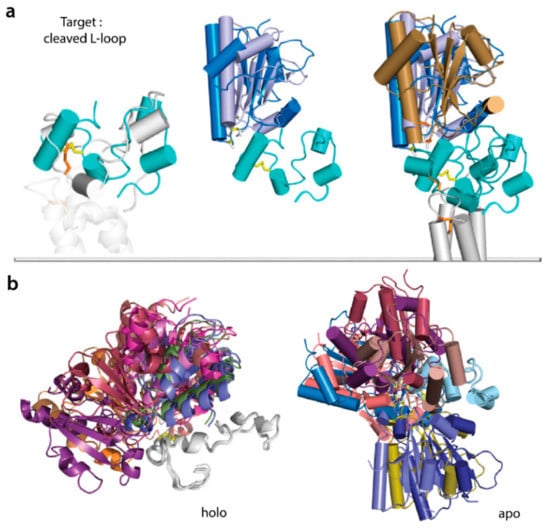 Protein–protein computational docking of PDI (ligand) constant conformation and cleaved L-loop (target) represented by different conformations. Docking was performed by HADDOCK using an information-driven method. (a) (left) Superimposition of L-loop cleaved from Model 1 of PDI–hVKORC1 complex at t = 441 ns of cMD simulation (grey) [] and taken at 4.62 µs of cMD simulation of cleaved L-loop from apo-h form simulated as an isolated species (teal). (Middle and right) The two best docking solutions obtained for PDI docking onto L-loop conformation with compact (closed) shape superimposed onto L-loop from Model 2 (middle) and on Model 2 (right), suggested as possible in []. (b) Superimposition of the best solutions obtained for PDI docking onto cleaved L-loop from holo- and apo-forms (X-ray). (a,b) Protein is shown as a cartoon with helices as cylinders or spiral and disulfide bridges as yellow sticks.