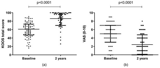 | KOOS | 66.66 (79.91–53.87) | 54.76 (68.45–44.64) | 0.015 |