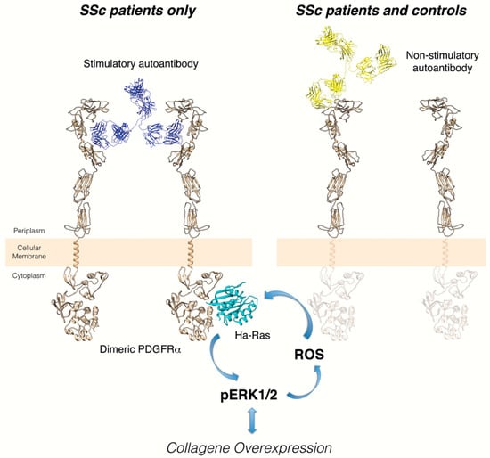 Human PDGFRα is a target of the autoimmune response in systemic sclerosis. Stimulatory anti-PDGFRα autoantibodies were detected in the whole IgG purified from the serum of SSc patients [42]. Unlike other autoantibodies previously described in the literature [43], these autoantibodies possess a biological activity and may contribute, as pathogenic factors, to tissue damage. In fact, upon binding to the receptor on the fibroblast cell surface, they can abnormally activate it, selectively inducing the Ha-Ras-ERK1/2 signaling pathway and reactive oxygen species (ROS) production and stimulating type I collagen gene expression. Triggering this intracellular loop by specific autoantibodies against PDGFRα might sustain the myofibroblast phenotype conversion and the persistent profibrotic response of SSc fibroblasts, suggesting a causal role in the pathogenesis of scleroderma [44]. There are no studies indicating the mechanisms responsible for the generation of anti-PDGFRα autoantibodies. One of the following may be postulated: (i) anti-PDGFRα autoantibodies are the result of the general break of tolerance towards self-antigens, which is a hallmark of SSc disease; (ii) more specifically, PDGFRα peptides recognized by autoantibodies may be the result of intracellular splicing processes caused by external triggers such as viral agents, e.g., CMV [45].