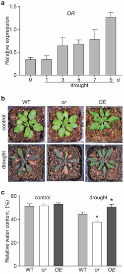 To investigate whether OR is involved in plant response to drought stress, we initially determined the fluctuation of OR transcript abundance in the wild-type (WT) A. thaliana seedlings under drought stress. Our quantification indicated a gradual induction of OR expression, when irrigation was withheld (Figure 1a).