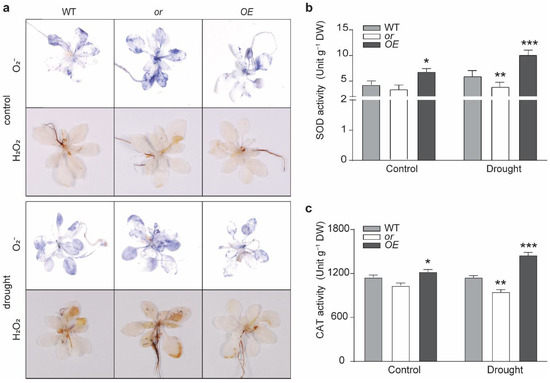 Because drought stress usually results in oxidative stress to plants, we stained the seedlings with 3,3′-diaminobenzidine (DAB) and nitrotetrazolium blue chloride (NBT), in order to assess their H2O2 and O2− contents, respectively. Under normal growth conditions, similar staining intensities for each molecule were observed among these lines (Figure 3a). Drought stress induced the production of H2O2 and O2− in all these lines, but at different levels. The production of both molecules was significantly alleviated in the OE seedlings, but was more severe in the or seedlings under the stressed condition (Figure 3a). We then determined the activities of superoxidase (SOD) and catalase (CAT), the two major enzymes responsible for scavenging ROS (as the first line of defense) [34,35,36]. Our results indicated remarkably enhanced SOD and CAT activities in the OE seedlings, under both control and drought-stressed conditions (Figure 3b,c). Activities of SOD and CAT in or seedlings were significantly lower than their corresponding WT levels under drought stress, but were at comparable levels with the WT under normal growth conditions (Figure 3b,c).