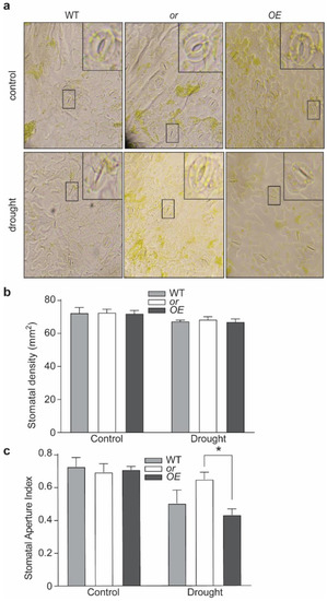 We also compared the stomatal density and stomatal aperture index (SAI) on the abaxial leaf surface. Seedlings with different OR backgrounds showed no significant difference in their stomatal densities, under both control and drought-stressed conditions, indicating that OR does not modulate the biogenesis and/or development of stomata (Figure 4a,b). No SAI difference was observed among different lines under the control condition (Figure 4c). Drought treatment resulted in smaller stomatal apertures in all three lines, among which the or seedlings had the highest SAI (Figure 4c).