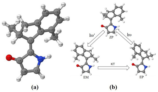 (a) Optimized geometry of the ZP isomer of DDIY. All atoms are labelled. (b) The schematic diagram of a working cycle of the three-step LDMRM DDIY. All geometries are optimized at the OM2/MRCI level.
