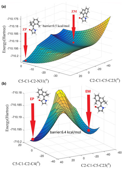 (a) Ground state potential energy surface near ZP and ZM geometries corresponding to dihedral angles C5-C1-C2-N31 and C2-C1-C5-C23. (b) Ground state potential energy surface near EP and EM geometries corresponding to dihedral angles C5-C1-C2-C4 and C2-C1-C5-C23. The above PESs were obtained with relaxed scan method at the CAM-B3LYP/6-31G(d) level, as implemented in Gaussian 09 program [29]. The energy barrier from ZM to ZP isomer, together with energy barrier from EM to EP isomer, are shown in subfigures (a,b), respectively.