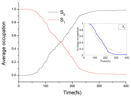 The average occupation of electronic states S and S varying with simulation time is shown in Figure 3. The average occupation of the S excited state can be approximately fitted with an exponential function: , where a stands for the corresponding decay rate constant and is the initial delay time. i.e., the decay mode of EP→ZP photoisomerization process is approximately exponential. The fitting curve we obtained is shown in the inset of Figure 3, and the obtained fitting parameters a and t are 0.0087 fs and 50 fs, respectively. Thus, the average S excited state lifetime of the EP isomer of DDIY is estimated to be about t + 1/a = 165 fs.