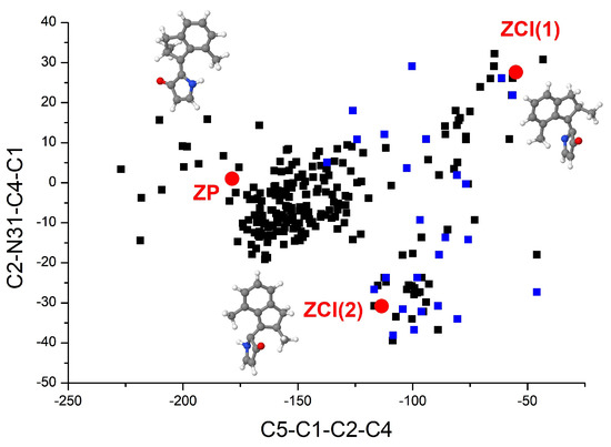 Distribution of the C5-C1-C2-C4 and C2-N31-C4-C1 dihedral angles at the hopping points of all 228 trajectories starting from the ZP structure of DDIY. Black squares denote trajectories returned to the reactant ZP isomer, while blue squares denote trajectories experienced ZP→EM photoisomerization. The ground state ZP isomers, ZCI(1) and ZCI(2) are also presented in this figure.