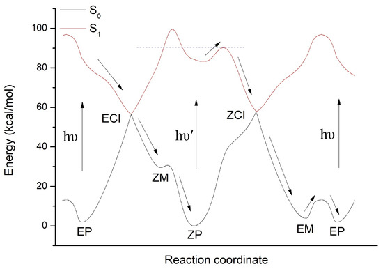 In order to deeply understand the working mechanism of molecular motor DDIY, energy profiles of the S and S state generated by the linear interpolation among EP, ECI, ZM, ZP, ZCI, and EM structures are shown in Figure 7. As we can see, after the S→S optical excitation of EP isomer, molecular motor DDIY rotates around the central C=C double bond in anticlockwise direction, and relaxes rapidly to the S state through the conical intersection ECI, then it arrives at the metastable ZM isomer. Due to the very low energy barrier from ZM to ZP isomer, as shown in Figure 2a and Figure 7, molecular motor DDIY reaches the ground state ZP isomer in a very short time (hundreds of femtoseconds) instead of stopping at the metastable ZM isomer.