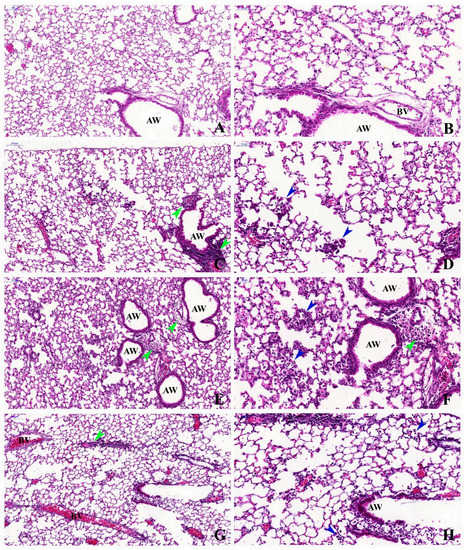 Representative photomicrographs of lung tissue (H&E staining). Control group: (A) 10× and (B) 20×, thin alveolar septa and no significant inflammation. PM group: (C) 10× and (D) 20×, inflammatory infiltrate alongside the bronchovascular bundle and mild presence of inflammatory cells in the alveolar space. LPS group: (E) 10× and (F) 20×, septal thickening and intense inflammatory infiltrate in the alveolar space and adjacent to the airways and blood vessels, with a predominance of polymorphonuclear cells. PM+LPS group: (G) 10× and (H) 20×, septal thickening, perivascular and peribronchial inflammatory infiltrates, and presence of inflammatory cells in the alveolar space. AW: Airway. BV: Blood Vessel. Green Arrowhead: inflammatory cell infiltration in the peribronchial and perivascular areas. Blue Arrowhead: interalveolar inflammatory cells. 10×: scale bar = 100 μm and 20×: scale bar = 50 μm.