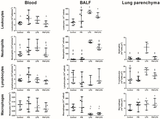 Graphical representation of inflammatory cells assessed in the blood (103 cells/mm3), BALF (104 cells/mL), and lung parenchyma (10−5 cells/μm2). Each point represents one animal and bars show the median. * p < 0.05 compared to the control group. ‡ p < 0.05 compared to the LPS group. ∆ p < 0.05 compared to the PM group. # p < 0.05 compared to the PM+LPS group.