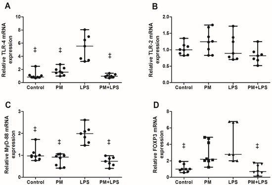 Graphical representation of (A) relative TLR-4 mRNA expression, (B) relative TLR-2 mRNA expression, (C) relative MyD-88 mRNA expression, and (D) relative FOXP3 mRNA expression assessed in the lung tissue. Each point represents one animal and bars show the median. ‡ p < 0.05 compared to the LPS group.