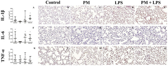 Graphical representation of IL-1β, IL-6, and TNFα assessment in the lung parenchyma and representative photomicrographs of immunostained lung tissue. (A) Graphical representation of IL-1β in the lung parenchyma. Representative photomicrographs of the lung parenchyma immunostained with anti-IL-1β antibody: (B) control group, (C) PM group, (D) LPS group, and (E) PM+LPS group. The PM+LPS group exhibits intense positive stains for IL-1β mostly in the epithelial cells, while in the LPS group the positive stains for IL-1β are mostly in inflammatory cells. (F) Graphical representation of IL-6 in the lung parenchyma. Representative photomicrographs of the lung parenchyma immunostained with anti-IL-6 antibody: (G) control group, (H) PM group, (I) LPS group, and (J) PM+LPS group. The LPS group exhibits positive stains for IL-6 mostly in the inflammatory cells and epithelial cells, while in the control and PM+LPS groups the positive stains for IL-6 are mostly in epithelial cells. (K) Graphical representation of TNF-α in the lung parenchyma. Representative photomicrographs of the lung parenchyma immunostained with anti-TNFα antibody: (L) control group, (M) PM group, (N) LPS group, and (O) PM+LPS group. Positive stains for TNFα are mostly in the epithelial cells. Each point of the graph represents one animal and bars show the median. ∆ p < 0.05 compared to the PM group. Scale bars = 50 μm.