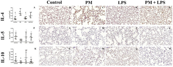 Graphical representation of IL-4, IL-5, and IL-10 assessment in the lung parenchyma and representative photomicrographs of immunostained lung tissue. (A) Graphical representation of IL-4 in the lung parenchyma. Representative photomicrographs of the lung parenchyma immunostained with anti-IL-4 antibody: (B) control group, (C) PM group, (D) LPS group, and (E) PM+LPS group. Positive stains for IL-4 are mostly in the epithelial cells. (F) Graphical representation of IL-5 in the lung parenchyma. Representative photomicrographs of the lung parenchyma immunostained with anti-IL-5 antibody: (G) control group, (H) PM group, (I) LPS group, and (J) PM+LPS group. Positive stains for IL-5 are mostly in the epithelial cells. (K) Graphical representation of IL-10 in the lung parenchyma. Representative photomicrographs of the lung parenchyma immunostained with anti-IL-10 antibody: (L) control group, (M) PM group, (N) LPS group, and (O) PM+LPS group. In the LPS group, positive stains for IL-10 are mostly in the inflammatory cells. Each point of the graph represents one animal and bars show the median. ‡ p < 0.05 compared to the LPS group. ∆ p < 0.05 compared to the PM group. # p < 0.05 compared to the PM+LPS group. Scale bars = 50 μm.