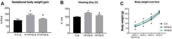 Gestational body weight gain of dams during pregnancy (A); offspring body weight at 21 days of age (B); and offspring body weight from weaning until 6 weeks of age (C). Control sedentary dams (P–C–S); high-fat, high-sucrose sedentary dams (P–HFHS–S); high-fat, high-sucrose exercised dams (P–HFHS–E); offspring from control diet sedentary group (C–S); offspring from high-fat, high-sucrose diet sedentary group (HFHS–S); offspring from high-fat, high-sucrose diet exercised group (HFHS–E), n = 6. Data are expressed as the mean ± SEM. Statistically significant differences (p ≤ 0.05) are indicated as follows: * vs. C–S, # vs. HFHS–S.